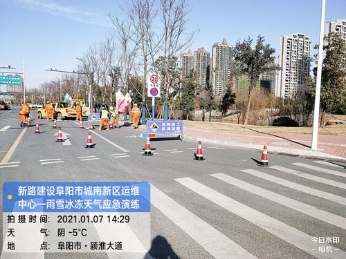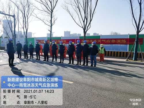 近日,阜阳市天气温度持续下降至零下8℃,雨雪天气随时到来,为了应对市政道路恶劣天气出现的雨雪冰冻灾害,保证城市交通正常运转,做到提前预防、储备充分、迅速响应等,我部联合市管桥梁项目制定了《运维事业部阜阳运维中心雨雪冰冻天气应急预案》,为确保预案安全、高效、科学、环保且行之有效,在公司安全科的指导下,于2021年1月7日下午在阜阳市城南新区清颍路与八里松路交口进行了预案演练。