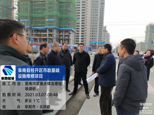 2021年3月7日上午,阜南县姜宁县长对我集团公司承建的苗南河黑臭水体治理项目进行了考察调研,城建局局长陈亮、环保局局长周卫东、经济开发区管委会规划局局长陈德军、重点工程服务中心等相关负责人,及集团公司运维事业部经理张仕龙陪同。