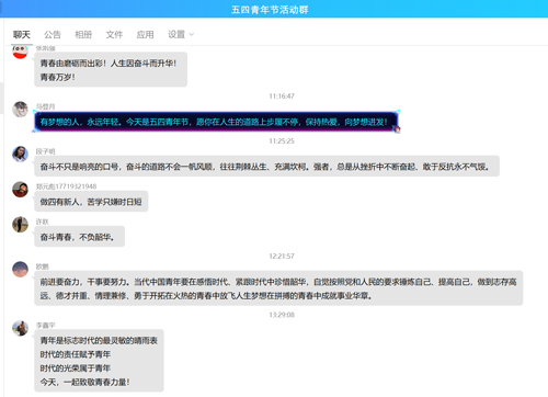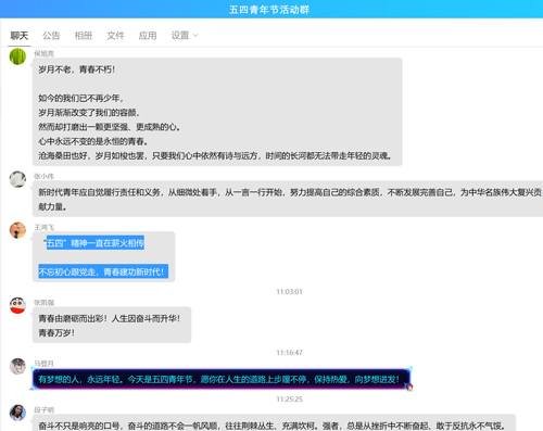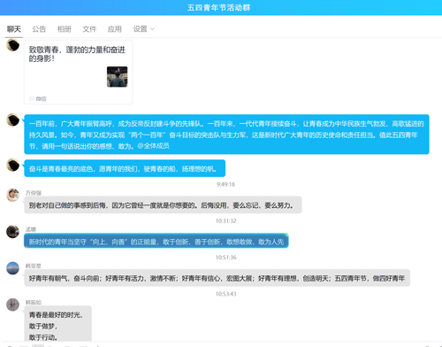 鉴于疫情期间不能聚集活动,支部采用线上进行。活动由党群综合科发起,组织公司全体青年每个人说出一句或者一段激励自己、表达爱国、爱人民的话语。