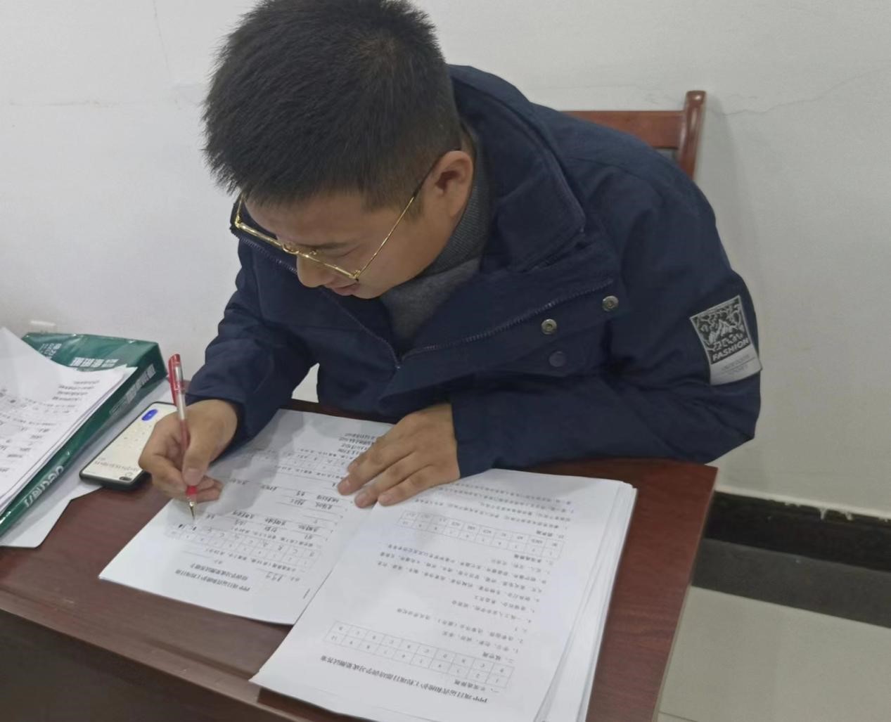 考试后王志强经理批改试卷