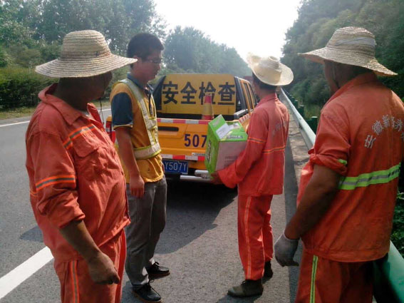 盛夏高温,热浪袭人。为做好夏季期间防暑降温工作,确保奋战在一线的施工人员的人身健康和安全,全椒管理处小修保养工程项目负责人欧鹏于8月14日下午带着防暑降温物品前往施工现场,亲切慰问在炎热天气下施工作业的工作人员,并代表项目部对他们坚守岗位、努力工作表示了衷心的感谢!同时,勉励大家抗酷暑、战高温,克服困难,确保小修保养施工顺利推进,并要求施工队(班组)负责人一定要合理调整作业时间,安排好员工生活,保障大家身体健康,饮食卫生,确保夏季高温施工安全。