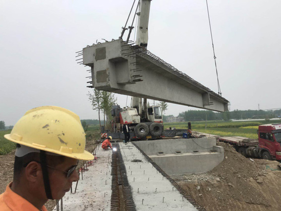 2019年4月15日上午,我项目部进行了赵桥桥梁吊装工作。我项目部在吊装施工前对吊车操作及施工班组全体人员进行了安全技术交底,并安排项目安全人员进行施工现场交通疏导,确保梁板运输与吊装作业安全顺利进行。随着各项准备性工作的有序进行,阜南危桥项目部第一片梁板吊装顺利就位。