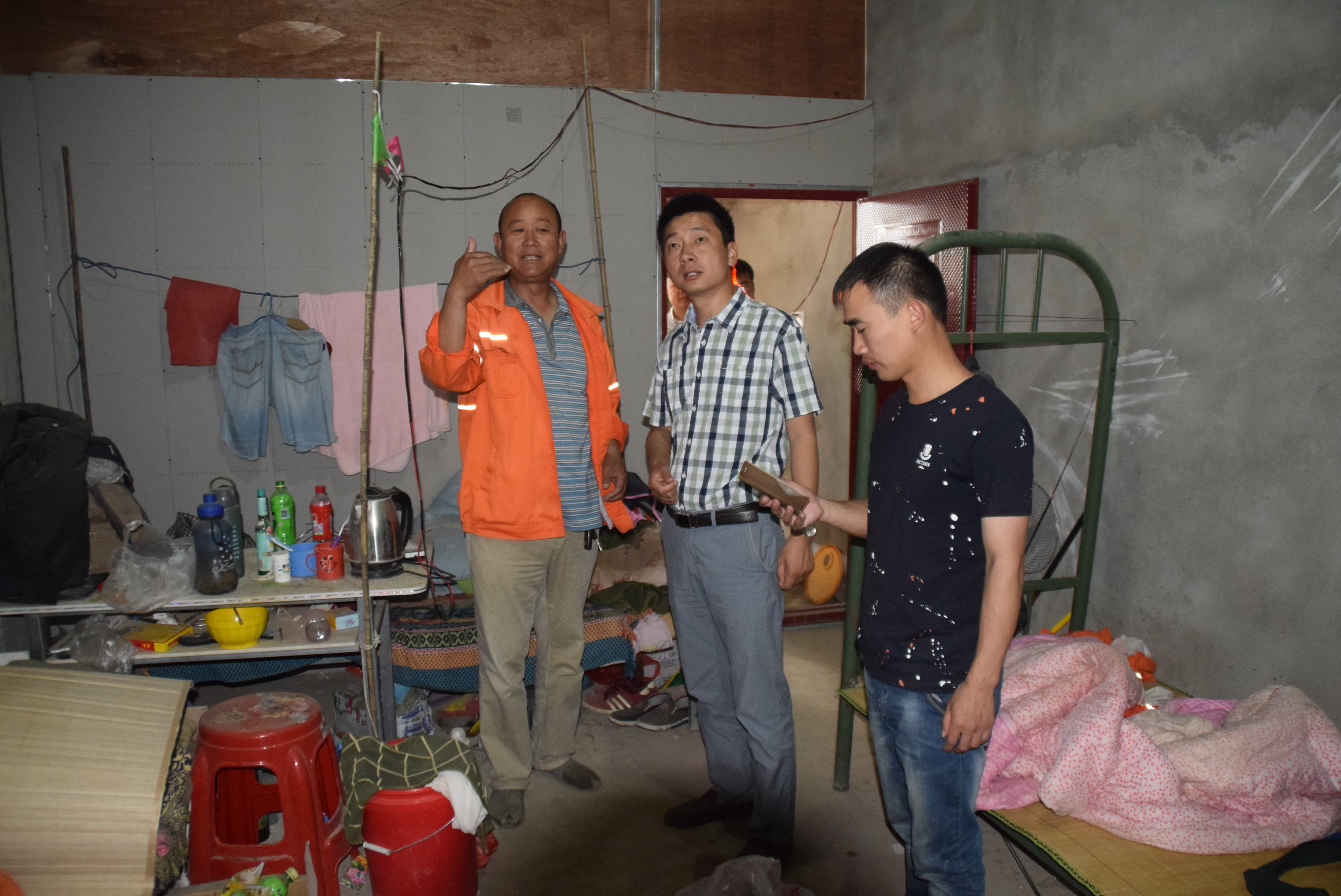 项目负责人刘家亮、安全负责人顾大强对劳务班组驻地进行专项安全检查