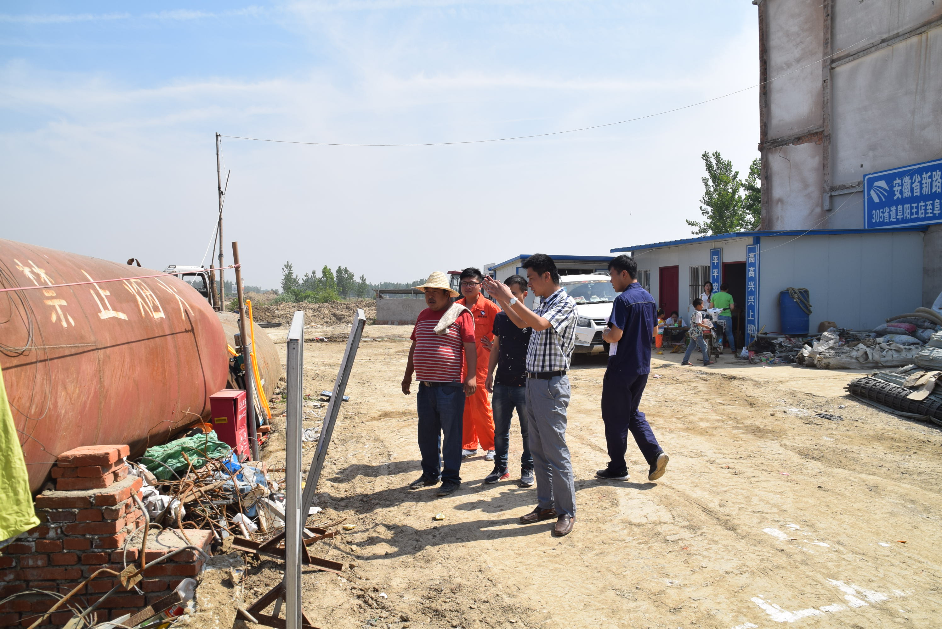 安全检查过程中,发现各劳务班组驻地有乱拉乱扯电线的不规范用电情况、油罐存放不符合要求等安全 隐患,项目负责人刘家亮对各班组长作出要求,各班组应高度重视安全问题,对存在的安全隐患及时整改,提高班组人员安全意识,保障自身人身安全,项目部将定期督查整改情况。