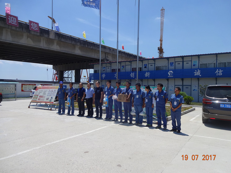 2017年7月19日上午,骄阳似火,暑热逼人,mansion88明升集团公司总经理唐谦、总工程师郝智明、工会主席冯贺到G105线南照淮河公路大桥维修改造工程01标项目部慰问一线员工,给一线员工们送去了绿豆、白糖、花露水等清凉防暑用品,让一线员工们在酷暑中感受到了丝丝舒心的凉意。