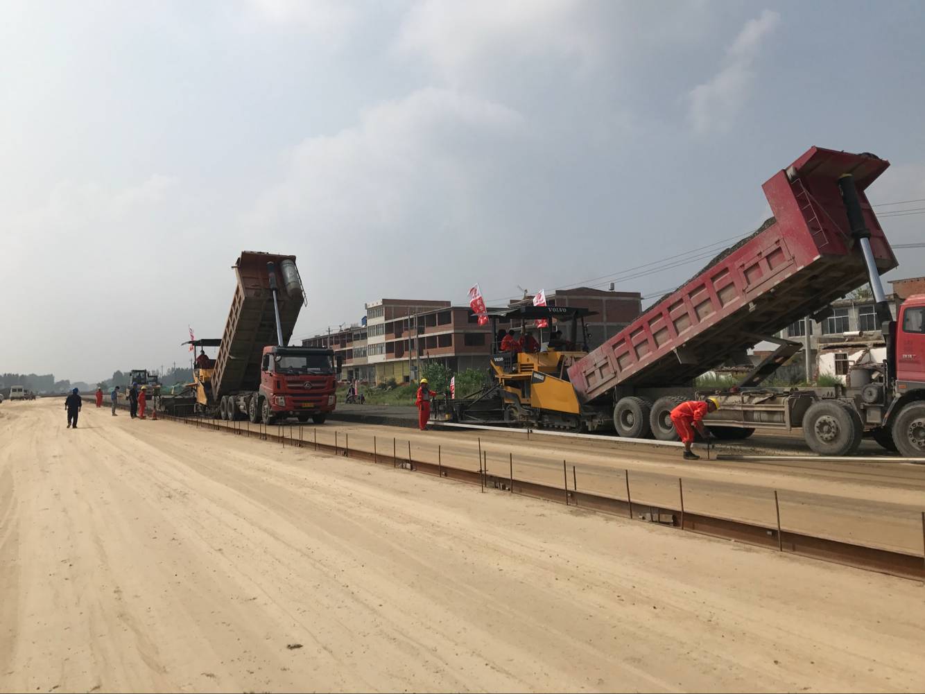 为抢抓当前晴好天气,推进工程建设,保证项目建设出形象、保进度,在前期建设施工料源考察、配合比设计、施工技术培训、项目技术交底、施工准备布置会议等近3个月的准备工作后,8月22日,由集团公司承建的G220项目二标段水稳试验段开始摊铺,此次水稳摊铺试验段里程为K27+000—K27+240处,全长240米。上午九点十六分,当第一车水稳混合料缓缓倒入摊铺机料斗时,标志着我项目成功完成工序转换即由线下转为线上;也标志着我项目即将进入路面基层施工的崭新阶段。
