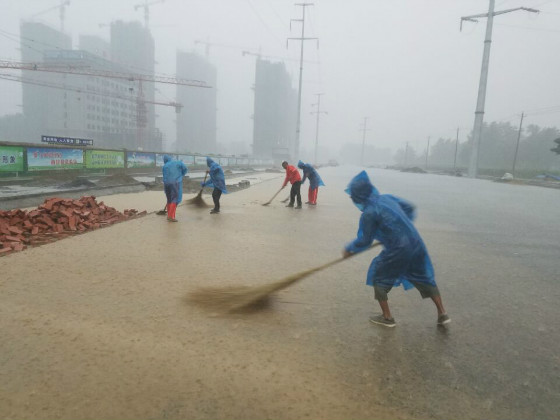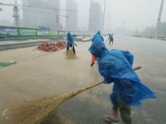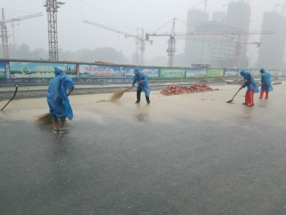 图为项目部员工冒雨清扫路面