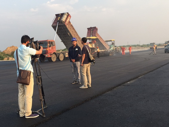 我部陪同电视台的同志观看了沥青施工的过程,并详细介绍了施工的流程及主要控制事项。