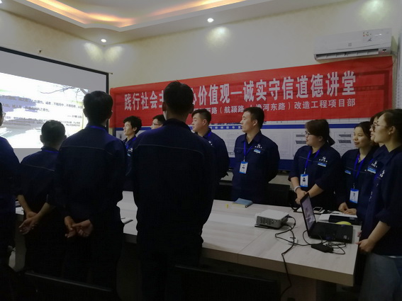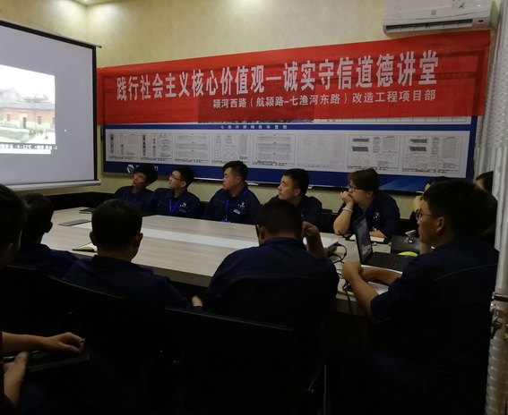 为强化项目部全体员工的诚信意识,进一步培养员工们的诚信行为,积极培育和践行社会主义核心价值观,6月26日,颍河西路项目部举办了以“践行社会主义核心价值观—诚实守信”为主题的道德讲堂活动。