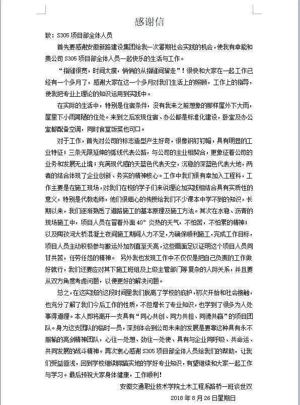 实习生感谢信