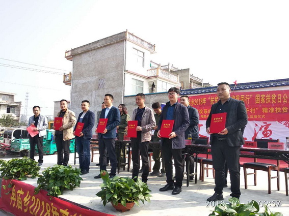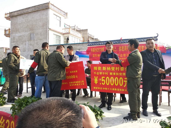 2018年10与月17日上午,阜阳市颍东新城区棚改及园区配套工程PPP项目部负责人王震代表mansion88明升参加颍东区冉庙乡2018年“扶贫路上,你我同行”国家扶贫日公益活动,并向颍东“千企帮千村”精准扶贫行动捐资人民币柒万元整。