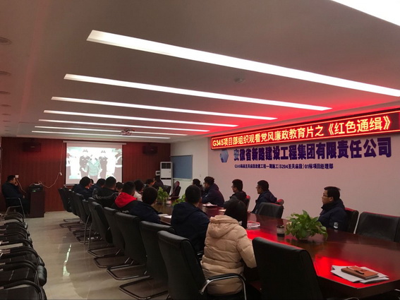 2019年12月16日,G345项目部利用下午空余时间组织全体员工在项目部会议室观看了党风廉政警示教育片之《红色通缉》,让全体员工更深入地认识到党风廉政建设学习的重要性。