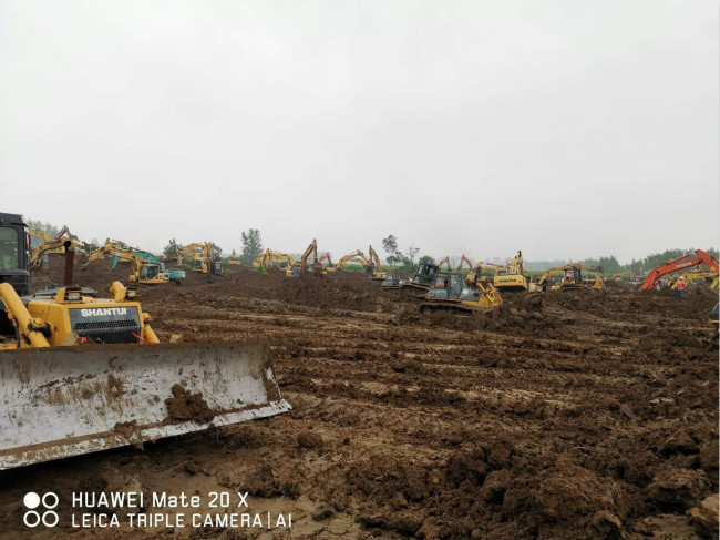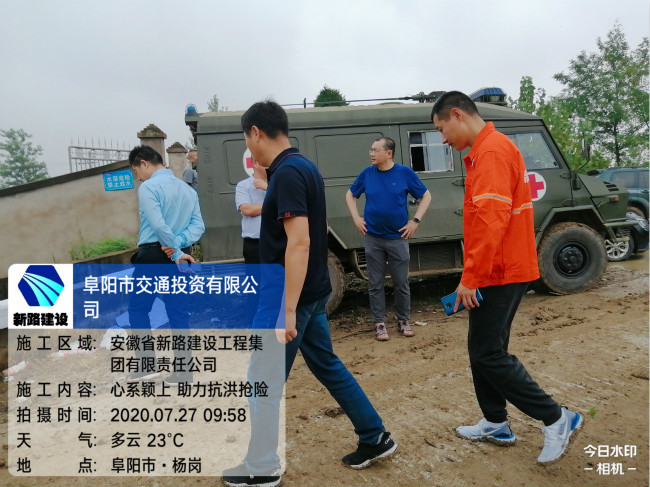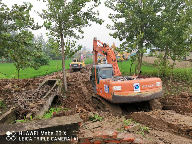 董事长唐谦、副总经理李超、阜南PPP项目负责人薛鸿儒现场调度抗洪机械