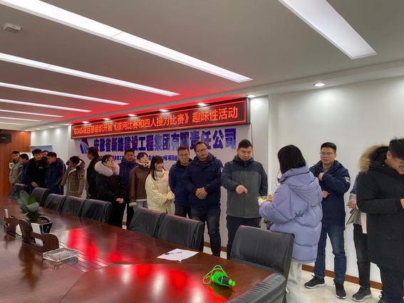 12月31日上午,在项目部院内进行了一场趣味拔河、四人接力赛,由各科室人员参加。本次比赛采取男女混合组队的方式,由项目副经理顾大强宣布活动方案并介绍活动规则,四人接力赛依次排队抽签分成五组,拔河比赛分成两组,哨声一响,比赛开始,现场气氛顿时活跃起来,双方队员很快进入紧张的状态,尽情的展示自己的才能。率先开赛的是拔河,比赛选手们奋力拼搏,双方队员们展开了一场速度与激情的比拼,整个项目部里,助威声、加油声、欢呼声此起彼伏,瞬时间拔河赛上变得沸腾起来,落后的队伍并没有气馁,而是以更加积极乐观的态度,发扬他们“你追我赶”的精神来进行下一轮四人接力比赛。下一轮比赛开始,每一组比赛都似乎变得更加激烈,四人接力默契配合共同完成比赛,个个精神抖擞,虽然夹乒乓球很吃力,但为不落下团队成绩,仍拼尽全力和同伴共同完成,每组队员凭借自己的实力和团队协作精神,赛出了风格,赛出了水平,现场的呐喊激发了五组队员昂扬的斗志。无论是男同志还是女同志在比赛上都充满了激情和活力,正所谓“巾帼不让须眉”,五队女将都表现出了特有的风范,为各自的队争取成绩。
