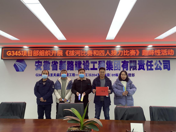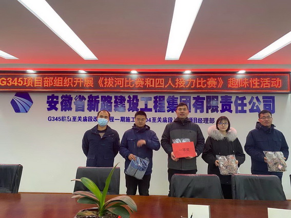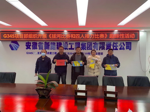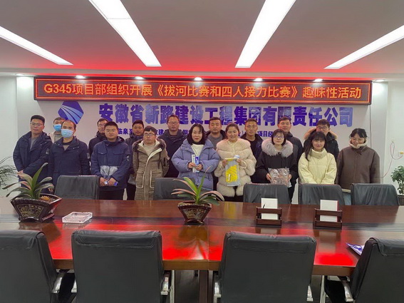 为了丰富全体员工的业余生活,增强员工的体质,促进员工之间的沟通交流,强化员工的凝聚力、向心力,此次比赛本着“友谊第一,比赛第二”的精神,G345项目部特组织开展“迎新年 庆元旦”全体员工拔河比赛及四人接力赛。让全体员工们从紧张的工作中解脱出来,从而更好的为新的一年努力奋斗。