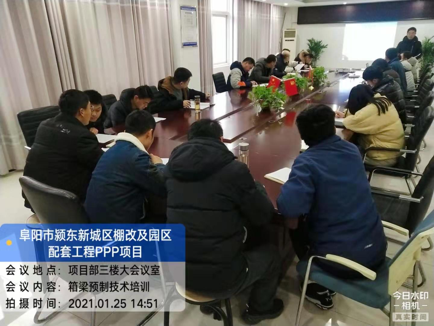 1月25日,为了加强质量工程管理,确保工程质量优质,阜阳市颍东新城区棚改及园区配套工程PPP项目部立足当下,组织员工开展预制小箱梁工程技术培训。培训由项目经理王震主持,项目部全体成员参加培训。