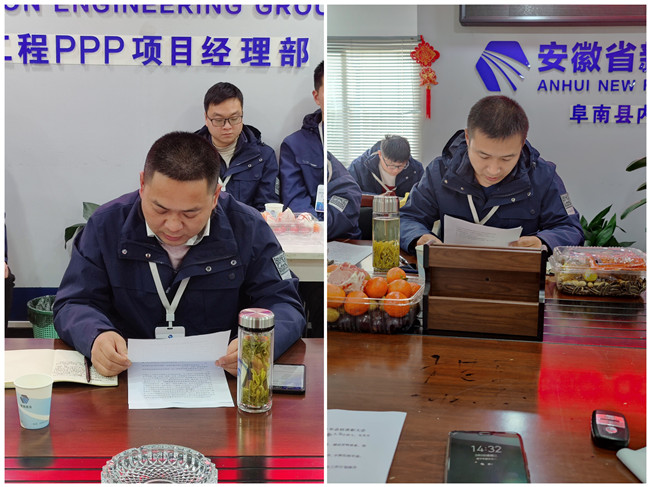 紧接着项目副经理余艮乐宣读《2020年度阜南PPP项目部优秀员工评选管理办法》,表彰2020年度在各岗位中5名优秀员工。分别为突出贡献奖:芮兵杰,最快进步奖:张凯,劳动模范奖:张帆,最佳组织奖:王忠臣,最近新秀奖:戴邓超。