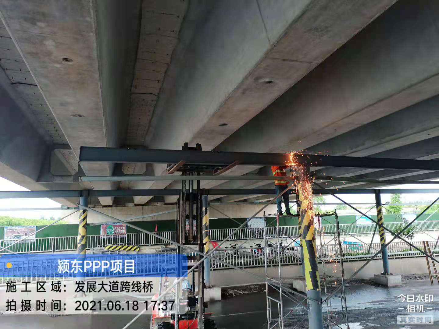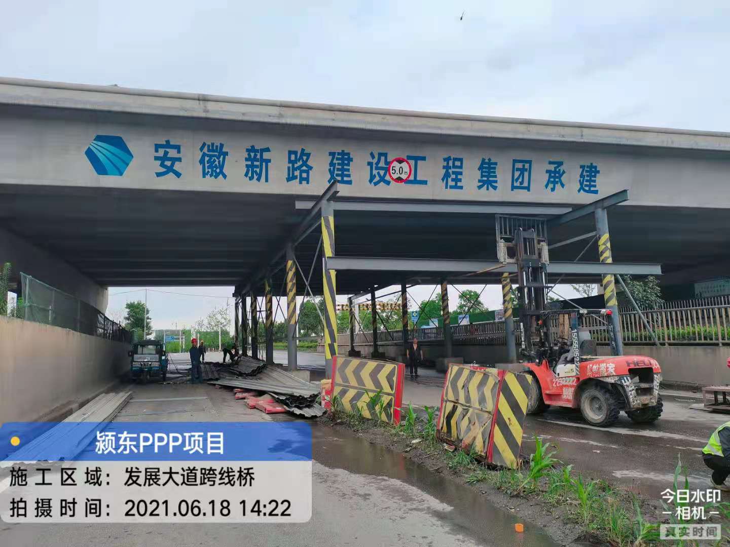 6月15日颍东ppp项目部发展大道跨线桥第七、八跨桥面系施工完成,18日项目部开始对下部防护棚进行安全拆除。
