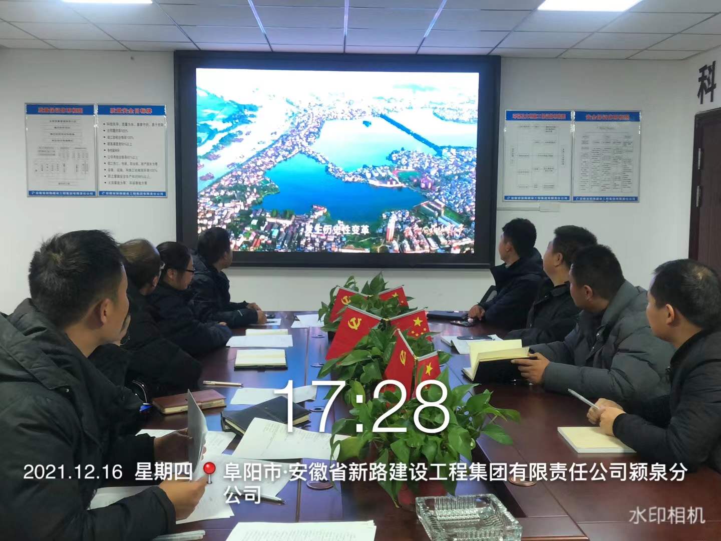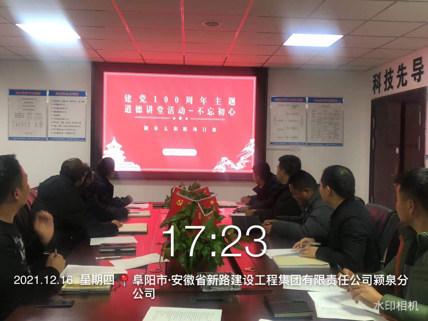 12月16日下午,颍泉区太和路项目部组织了一次道德讲堂活动,活动主题不忘初心,主要讲解了建党百年的历来发展,不忘初心的精神,第一环节大家一起合唱《没有共产党就没有新中国》,第二环节大家一起了解党的百年发展历程,第三个环节员工集中观看大型文献专题片《敢教日月换新天》第二十四集《千秋伟业》。