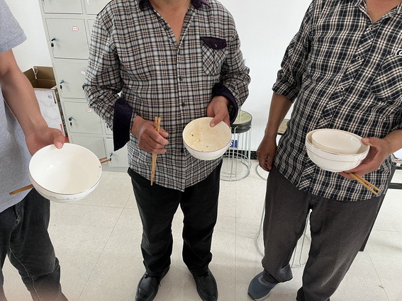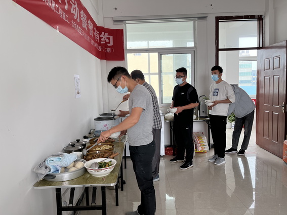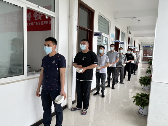 图为:项目全体人员有序排队进行打饭