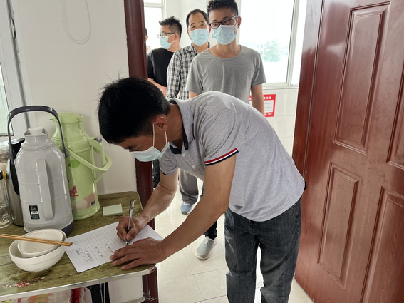 图为:大家有序排队进行签名就餐