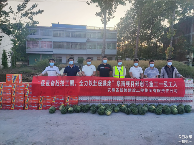 5月16日下午,阜南县重点工程建设管理服务中心、阜南项目部在施工现场联合举办“昼夜奋战抢工期,全力以赴保进度”慰问活动。县重点工程建设管理服务中心市政股股长丁现辉,阜南项目部项目经理薛鸿儒、项目总工余艮乐等一行前往施工现场,慰问奋战在施工一线的工人,为工人送来西瓜、泡面、火腿肠、矿泉水等慰问品。