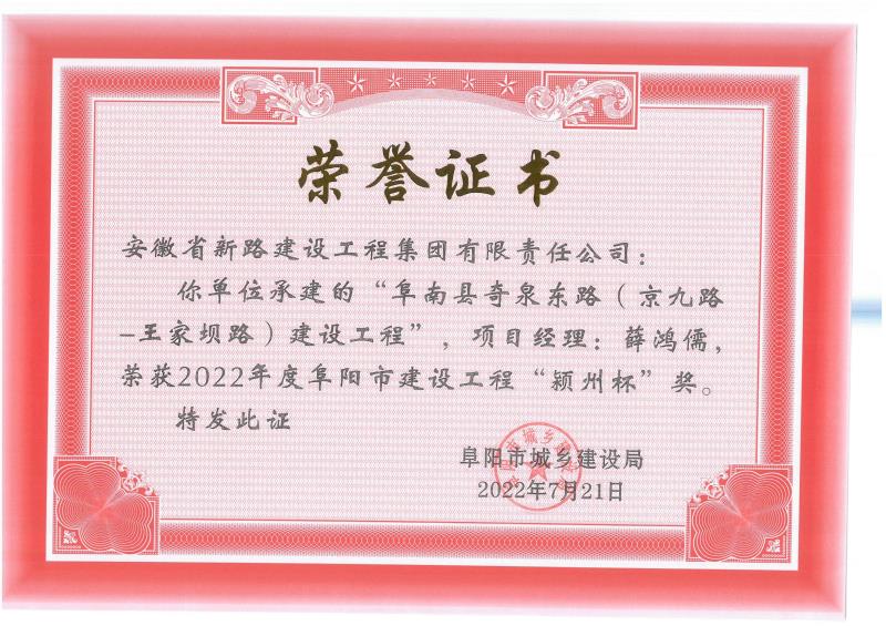 阜阳市“颍州杯”是继《建设工程质量标准化创建示范工程》《市级建筑施工安全生产标准化示范工地》阜南PPP项目奇泉东路又一个市级奖项。是对项目质量的检验也是对项目团队管理水平的又一次认可。