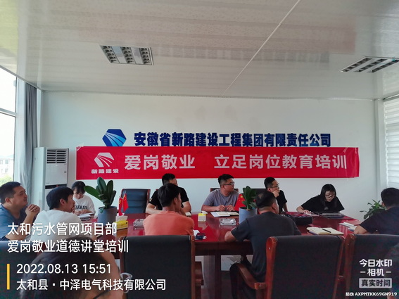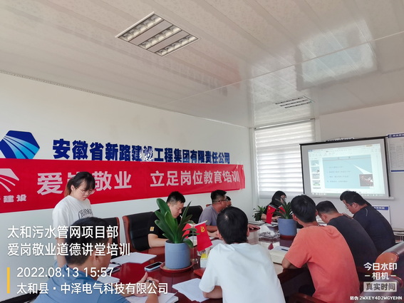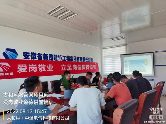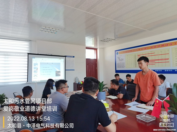2022年8月13日下午,太和税镇及污水管网项目部开展“爱岗敬业、立足岗位”职业道德讲堂培训,项目部管理层及项目全体成员参加了培训。
