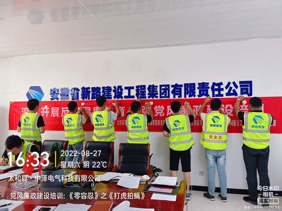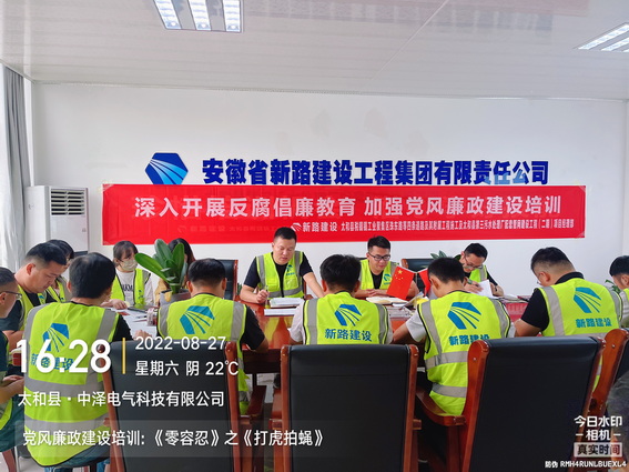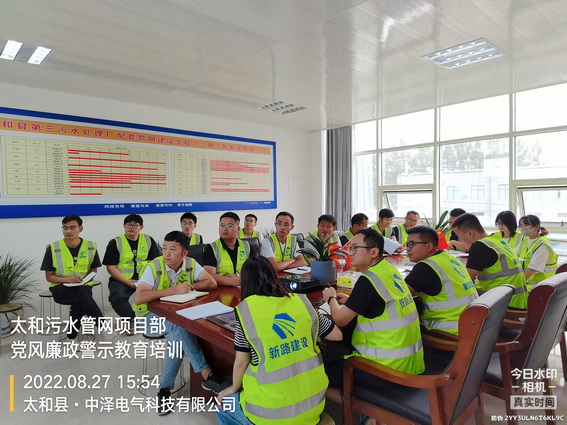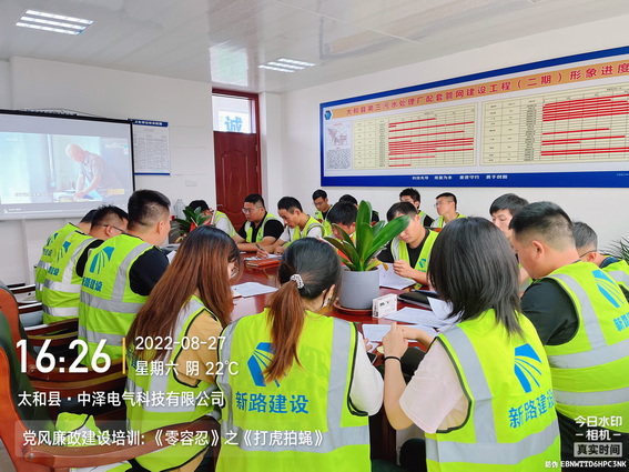 推进全面从严治党纵深发展,深化党风廉政建设和反腐败工作,增强项目全体人员廉洁自律意识,提升全员拒腐防变的思想自觉和行动自觉,8月27日下午,太和税镇及污水管网项目组织全体员工观看专题警示片《零容忍》第二集《打虎拍蝇》。