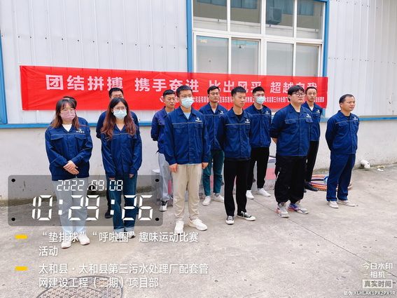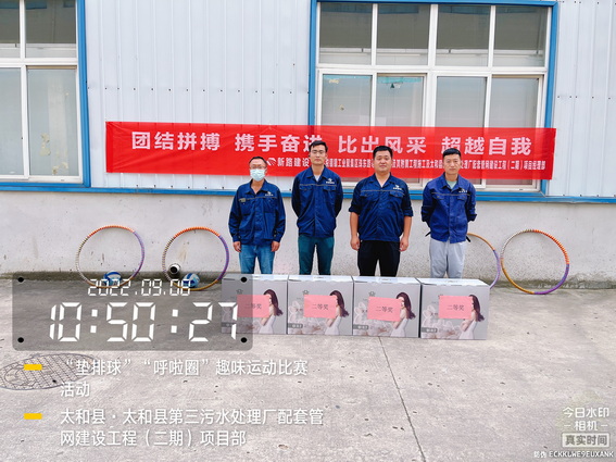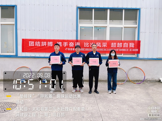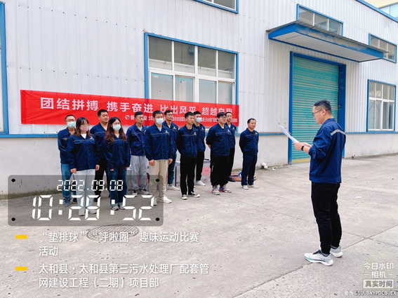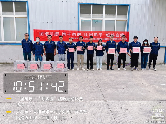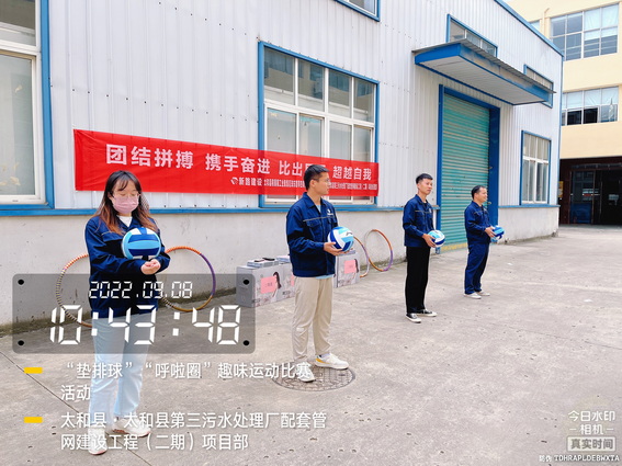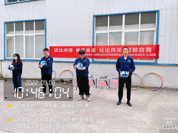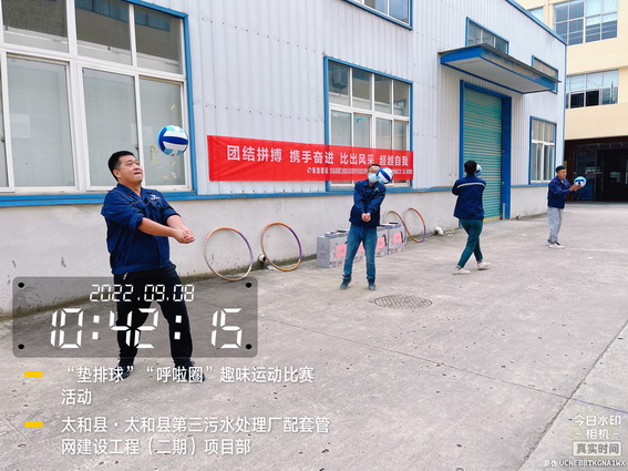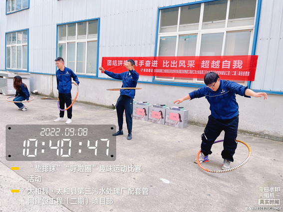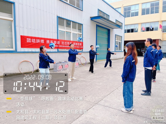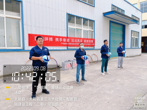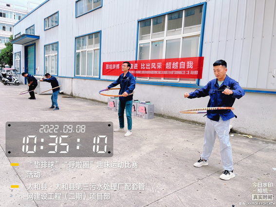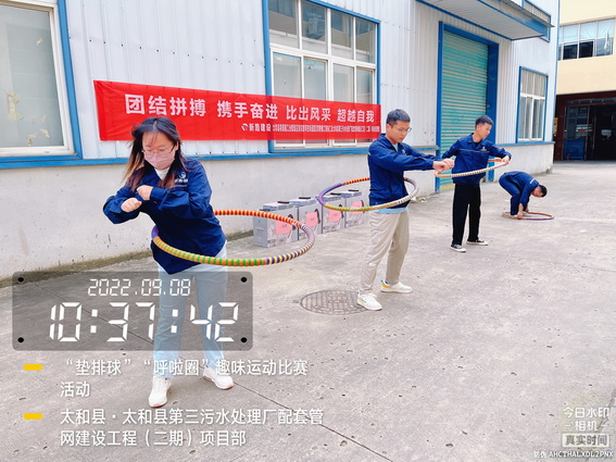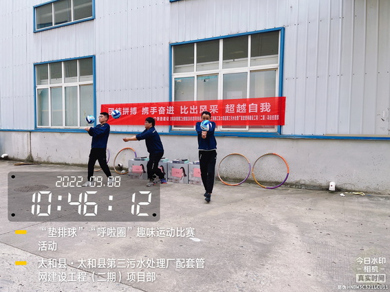 为了“迎接中秋”的到来,增强我部的凝聚力,加强各科室的沟通与交流,促进友谊,展示我部人文风采。9月8日上午在太和污水管网项目部院内举办了“用激情挑战工作,以健康武装青春”为主题的“呼啦圈”、“垫排球”趣味运动比赛活动。