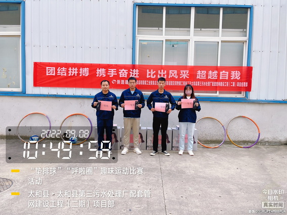 活动开始由项目经理助理宣布活动方案并介绍活动规则及流程,在此次活动上,共有两个活动项目:呼啦圈、垫排球。每组四人自由组合,参加比赛的队友们斗志昂扬,所有参赛选手争分夺秒练习比赛项目,认真进行赛前准备工作。在呼啦圈比赛中大家玩得不亦乐乎。垫排球项目的比赛更是异常激烈,参赛队友一个个精神抖擞,每组队友们都随着比赛加油鼓励,场面十分热闹。整个运动比赛充满了趣味性和挑战性,现场工作人员追踪记录着比赛过程,拍下了各个精彩的瞬间。整个赛场给太和税镇及污水管网项目部带来了浓浓的暖意,比赛经过激烈的比拼,根据相同的时间累计个数最多,角逐一、二、三等奖。