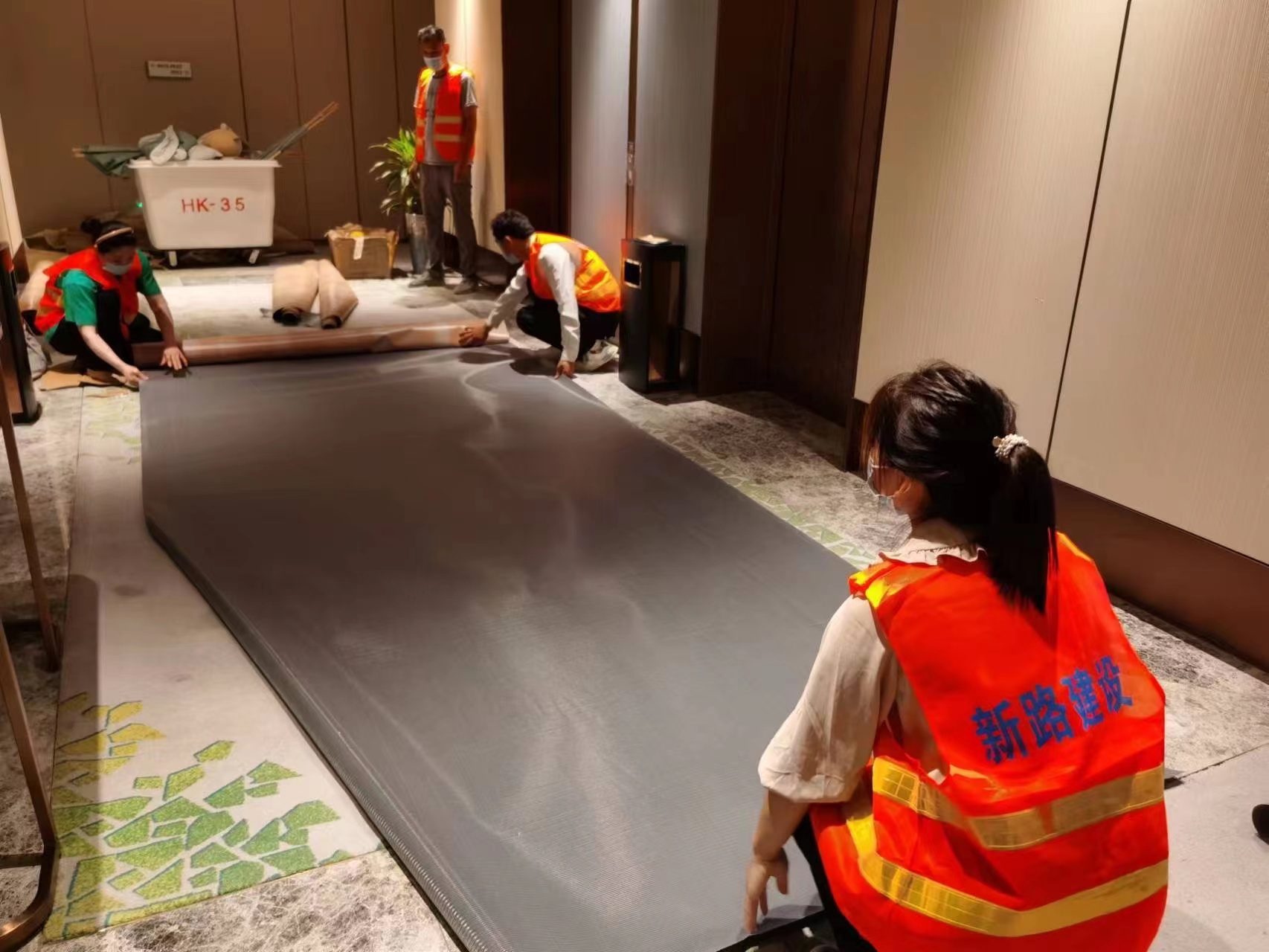 疫情就是命令,防控就是责任。接到援建任务后,项目部迅速反应,立即组织科长以上人员开会研究,决定抽调80余人组建施工突击队伍,按专业进行分工,成立施工管理组、物资采购组、后勤保障组,迅速进驻疫情隔离酒店施工现场,一场与时间赛跑与疫情抢时间的战斗就此打响。进入现场后,施工突击队按照分工迅速开展酒店外围围挡、医疗废物临时储存间、“三区两通道”、地板革铺设等施工任务。据了解,此次共有296个房间改造任务,地板革铺设约9500平方,经专家验收合格后交付相关部门使用。