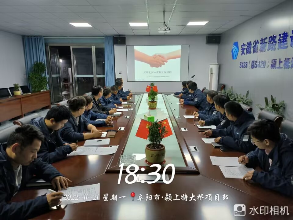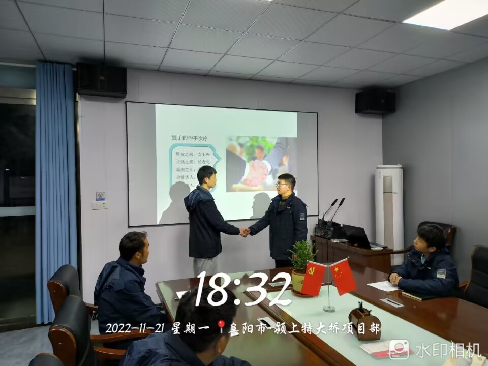 文明礼仪是个人心理安宁、心灵净化、身心愉悦、个人增强修养的保障;礼仪是家庭美满和睦的根基;礼仪是社会文明进步的载体。要继承弘扬这一优秀的传统文化,加强社会主义精神文明建设,文明礼仪的宣传教育必不可缺。为了加强项目部成员的个人礼仪修养,弘扬我国的优秀传统文化,S428颍上大桥项目部于2022年11月21日晚开展了文明礼仪活动。