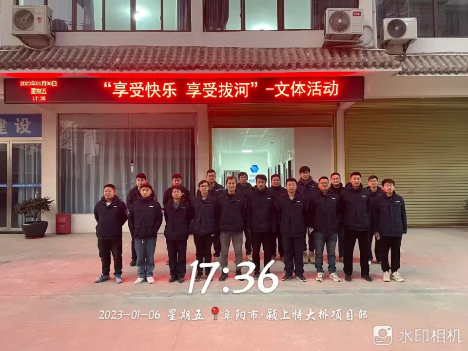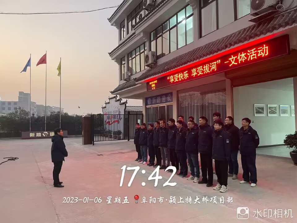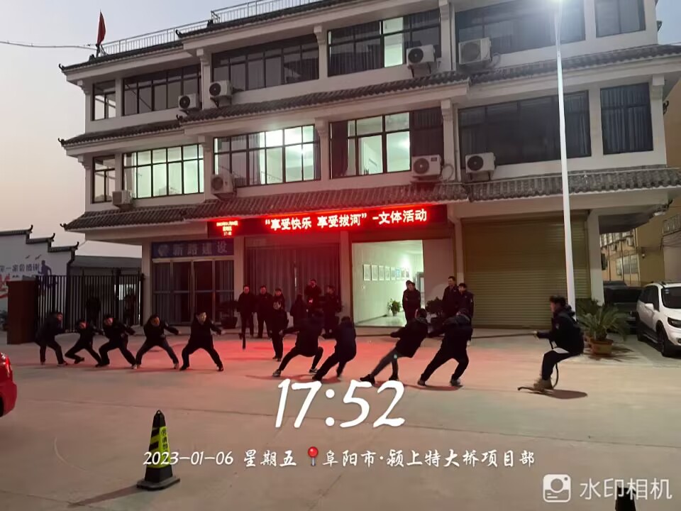 2022年1月6日下午,颍上S428大桥项目部举办“享受快乐 享受拔河”拔河比赛文体活动,项目部全体员工纷纷以极大的热情参与到此次活动中。本次比赛共A、B、C、D,4支小组队伍参赛,每支小组队伍由不同科室人员自由协同组成。比赛实行淘汰制晋级方式,抽签分组决定比赛顺序。待项目经理兼裁判员刘家亮宣布活动开始,副裁判员季晓俊宣读比赛规则后,参赛队员们一个个摩拳擦掌,排好阵势。随着裁判员“起绳!拉紧!预备!吁……”,哨声响起,比赛现场立刻沸腾,在场下项目其他员工震耳欲聋的“加油”助威声中,场上两队小组的队员一个个铆足了劲儿,涨红了脸,全力以赴,寸土必争,握紧绳子使劲往后拉,绳子中间的红线也在不断的左右摇摆。现场加油声、呐喊声此起彼伏,飘荡在整个颍上S428大桥项目部院子内,场面好不热闹。