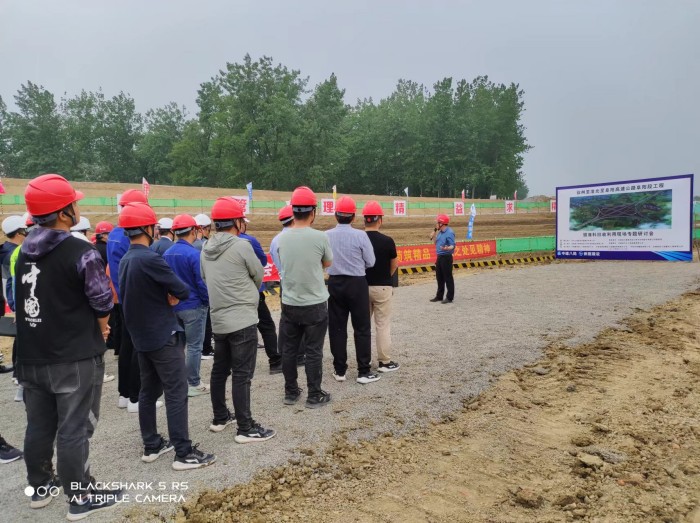 项目总工王建立带队实地观摩并主持现场会议,观摩团一行先后抵达三塔互通施工现场观摩路基填筑固废料回收利用,小运河处参观沟塘清淤回填检测流程,路基三工区观看3%石灰土路基填筑施工试验段。在王建立的主持下各工区负责人介绍了相关的路基施工技术及工艺的详细流程。