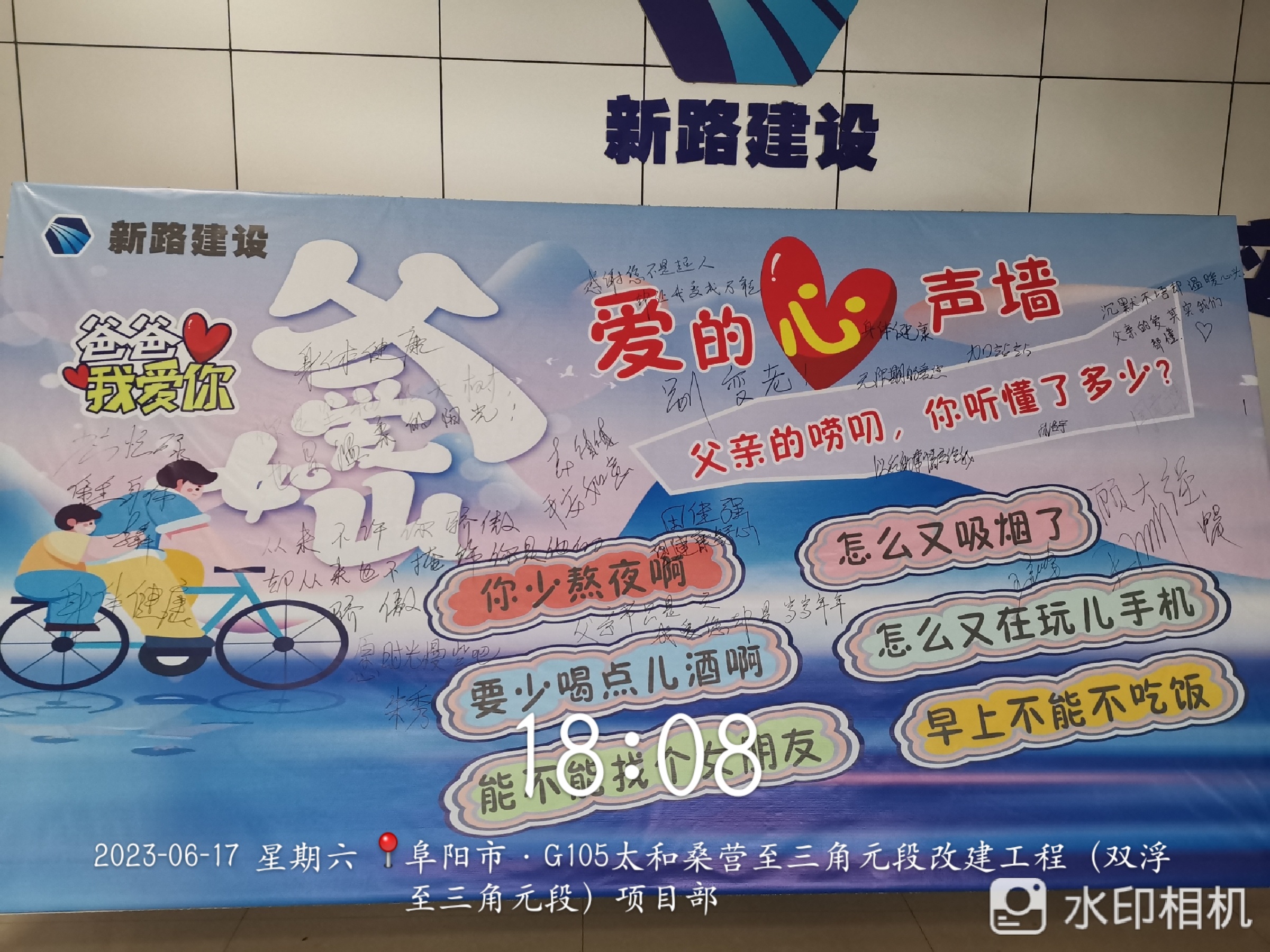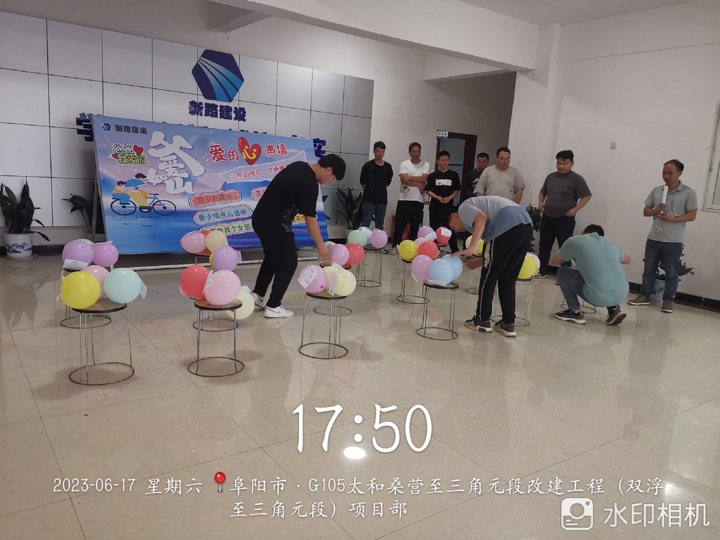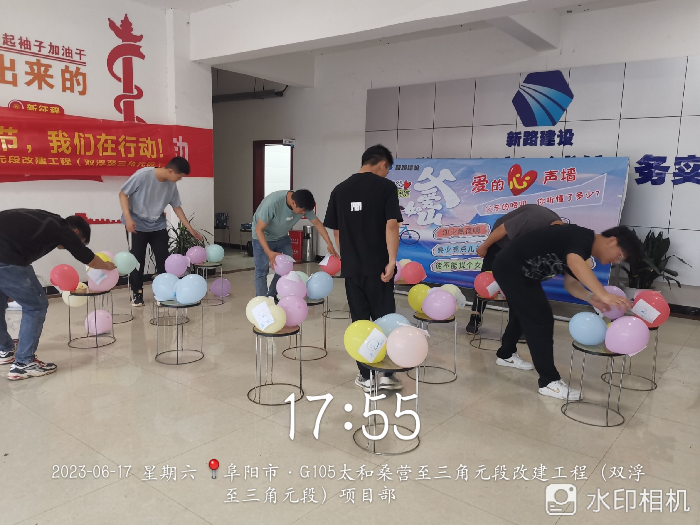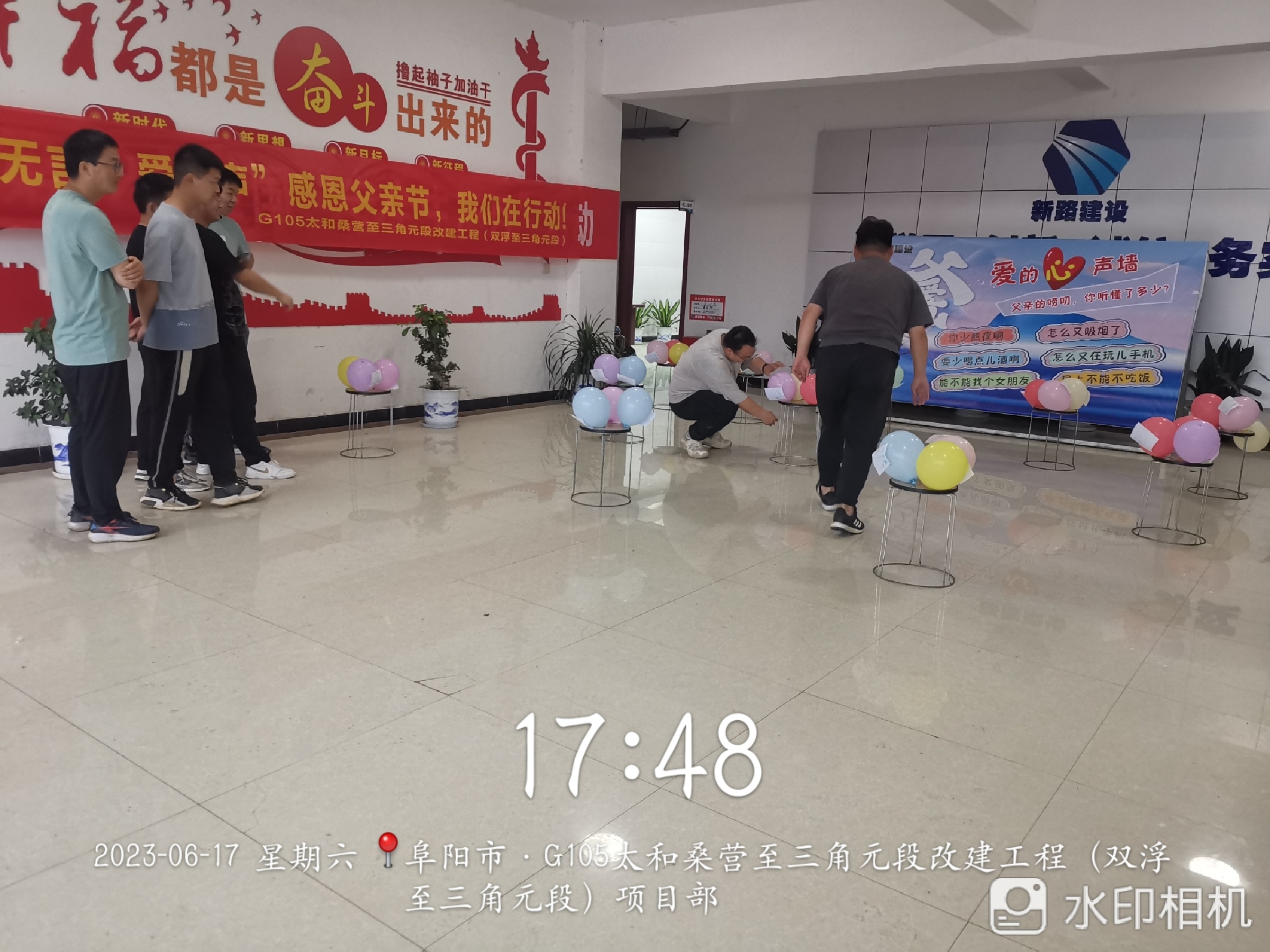 本次活动由“父亲的心声墙”“代沟消消乐”与“爱的告白”三部分组成。为烘托节日氛围,项目综合科提前收录大家所熟知的父亲的口头禅及两代人存在的代沟问题,并将口头禅及代沟问题做成展板展示给大家。展示结束后活动步入“代沟消消乐”环节,活动区域内有20组父子(女)之间的代沟道具,道具(气球)上写着不同的代沟问题,如“熬夜”“不结婚”“懒癌患者”“玩手机”等等,每组2个,分布在不同的位置。参加活动选手按照既定路线打开相应的道具查看里面的“代沟”,找到相同的“代沟”道具,及时返回原点告知裁判员“代沟”编码,编码正确即可消除“代沟”。经过激烈的角逐,闫竟博、李犇、王洲、孙浩宇、李长顺、田佳强6名选手分别获得父亲节小礼品一份。“代沟消消乐”活动结束后,项目部全体员工于展板处写下对父亲想说的话并签名,以此展示对父亲的爱。