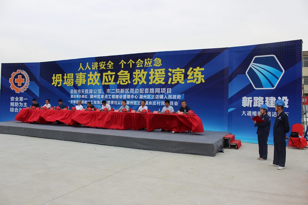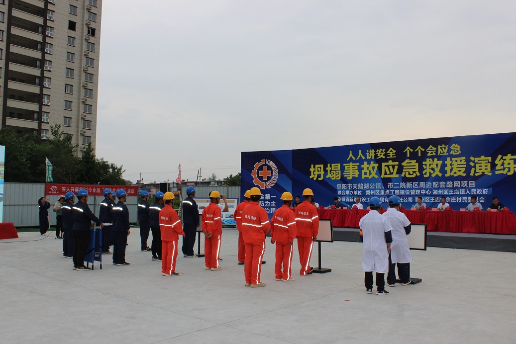 为了深入贯彻“人民至上、生命至上”的安全生产方针,提高项目部人员及作业人员的安全意识,使项目部员工切实掌握坍塌应急的技能、技巧。2023年6月16日下午颍州区王店镇人民政府、颍州区重点工程建设管理中心与mansion88明升在阜阳市天鹅湖公馆、市二院新区周边配套路网项目联合举办2023年“安全生产月”坍塌事故应急救援演练活动。