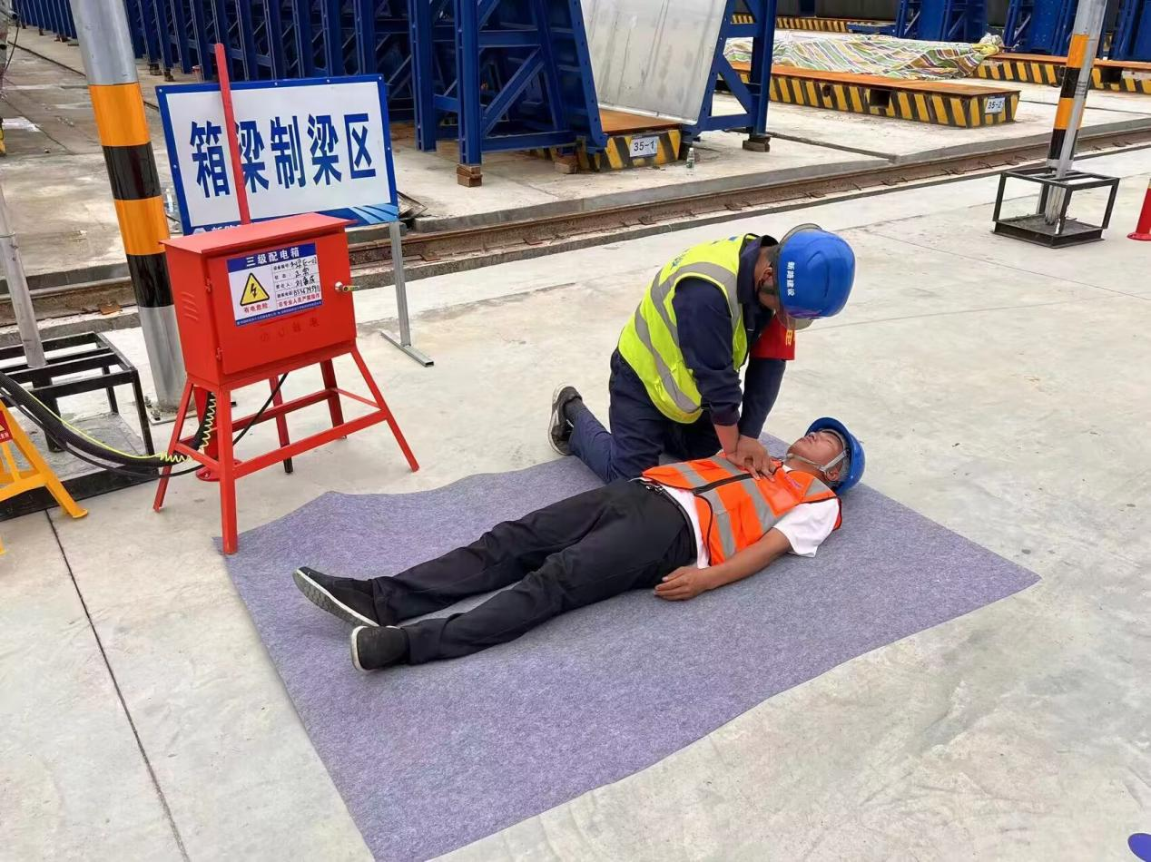 项目安全科提前编制周密的演练方案,并对触电事故应急演练进行讲解,确保各小组人员明确应急职责,重“练”少“演”,达到应急演练目的。演练期间,应急救援小组在接到事故报警后,立即启动触电事故应急预案,救援人员到达现场后,第一时间切断电源,用木棍挑开伤员接触的电线,医疗救援组为伤员进行心肺复苏法和人工呼吸法,展开了一场紧急救援。演练过程项目应急救援小组有效组织、反应迅速、高效运转,最大限度地减少事故危害。集团公司副总经理李超、董事长唐谦、总监理工程师侯奎、项目办副主任王壮飞等领导对本次演练进行了观摩,并对本次触电事故应急演练进行了高度评价。