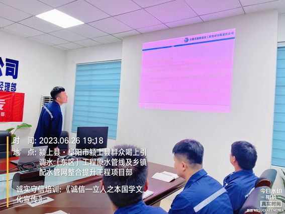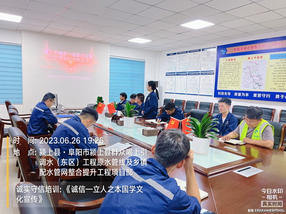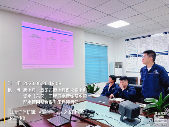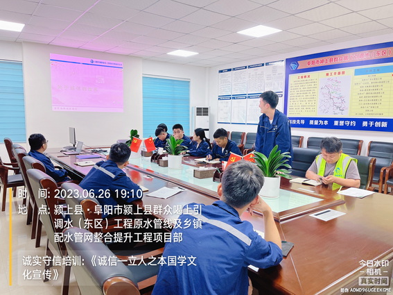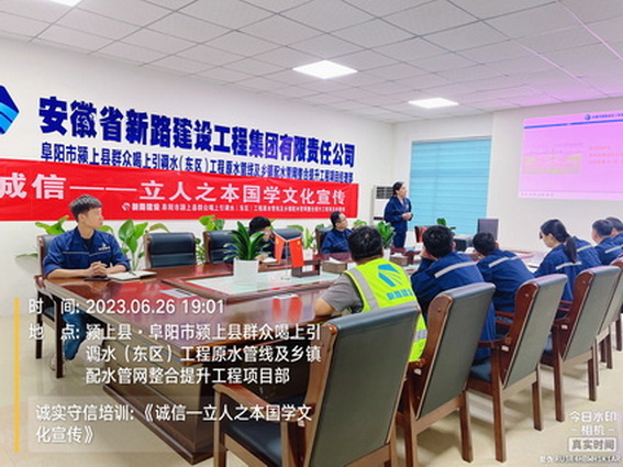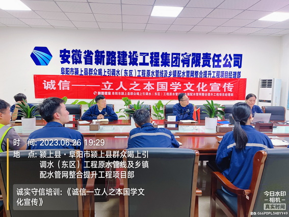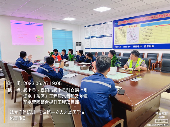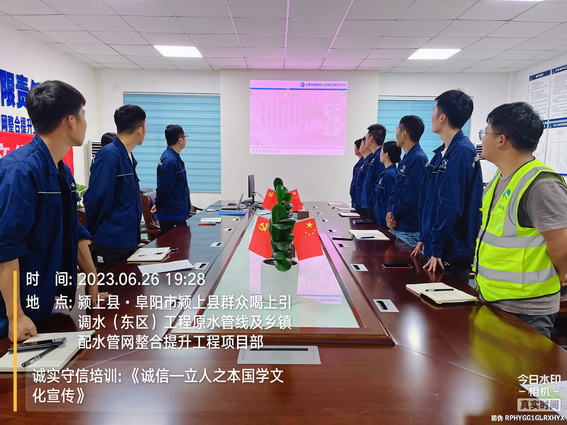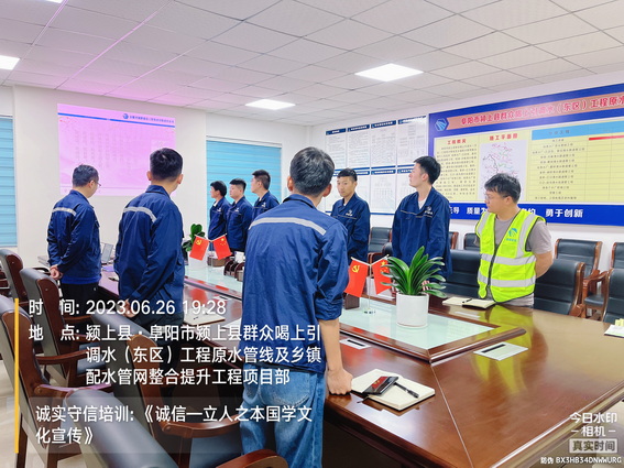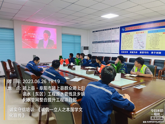 6月26日,颍上管网东区项目全体人员在项目部会议室开展“诚信--立人之本”国学文化宣传主题教育活动。