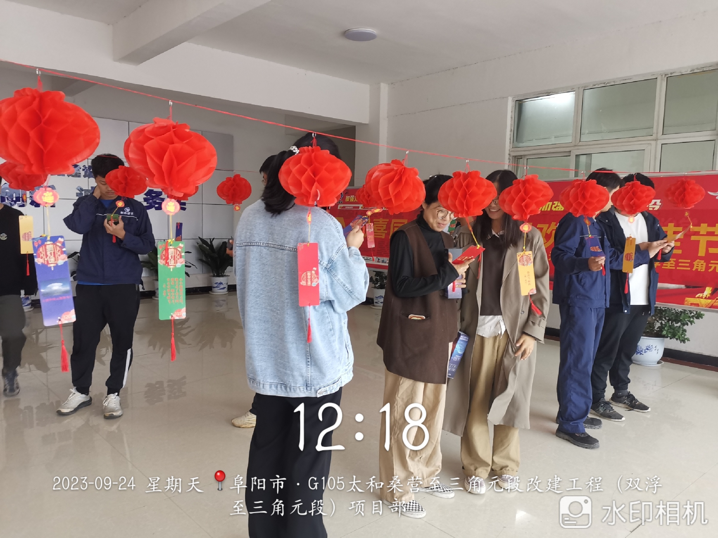 活动之前,工作人员精心布置了场地。在工作人员的巧手下,一张张扁平的折纸变身为一颗颗圆胖胖的喜庆的红灯笼,坠上彩色的灯谜纸,营造出满满的喜庆祥和的中秋氛围。