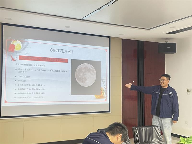 活动旨在介绍中秋节的历史与由来,员工们积极参与中秋主题诗词朗诵。活动开始时,综合科赵文振通过介绍中秋节的起源、神话故事和民俗习俗,让大家更多地了解中秋节的文化内涵,随后大家参与了诵朗活动,参与员工以朗诵诗歌、散文的形式表达了对中秋节的热爱和憧憬。