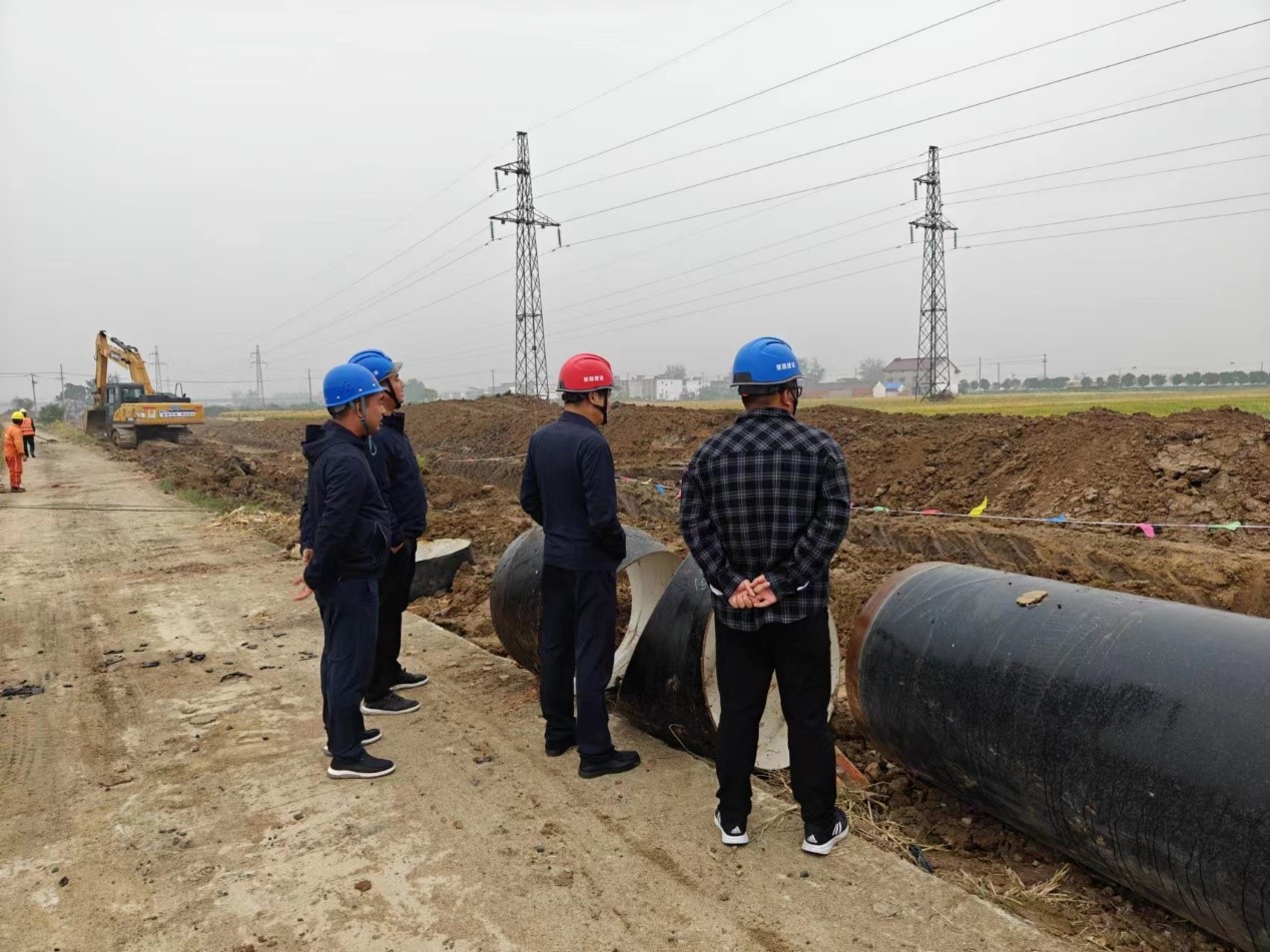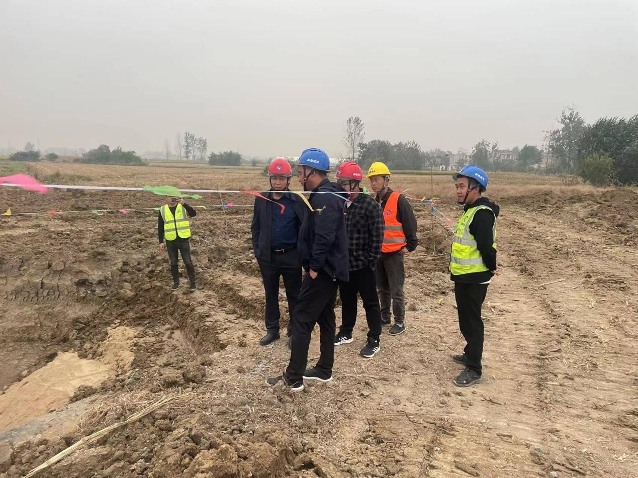 2023年10月19日下午,集团公司副总经理李超莅临颍上东区管网项目施工现场检查指导工作,项目部相关领导和各工区负责人等陪同检查。