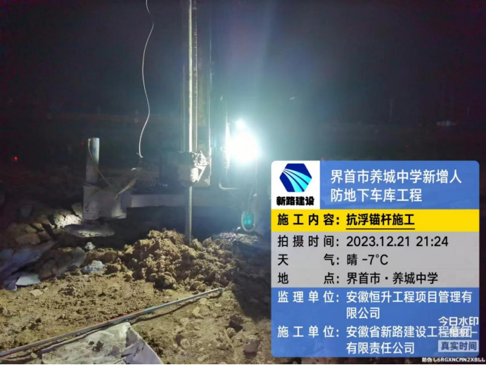 2023年12月29日界首市养城中学新增人防地下车库工程抗浮锚杆施工完成。