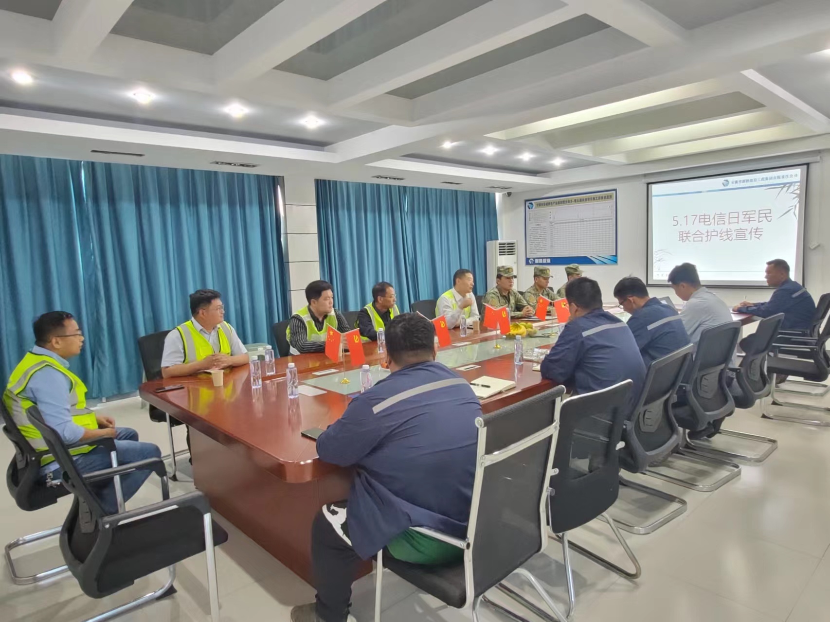 2024年5月16日上午,长线局、军区各级领导莅临宁国市紫云路改造项目,针对“5月17日电信日军民联合护线”进行宣传,建设单位、施工单位相关人员陪同参加宣传会。