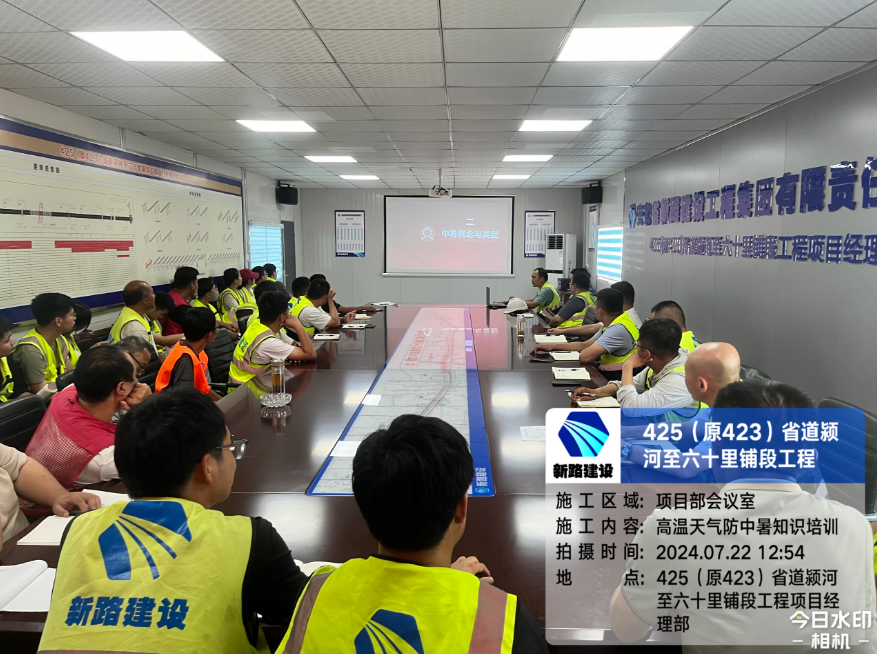 2024 年 7 月 22 日,为切实保障员工的身体健康和生命安全,425 项目部精心组织了一场关于高温天气防中暑知识的培训活动,本次活动由项目经理王震主持,项目部全体成员参加。