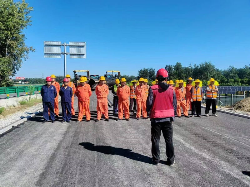 本次沥青混凝土试验段设在三塔枢纽互通BK0+556-BK0+918,长360m,宽9m,压实厚度8cm。为保证试验段各项工作顺利推进,项目部提前谋划、统筹协调,多次召开专题筹备会和现场技术交底会,对人员分工、机械配置、现场试验检测、摊铺碾压、机械设备维护等各项工作进行详细部署。在大型摊铺机、压路机等机械设备的轰鸣声中,现场施工人员严格按照标准化进行施工作业,分工明确、各司其职,对摊铺各环节进行全程盯控。