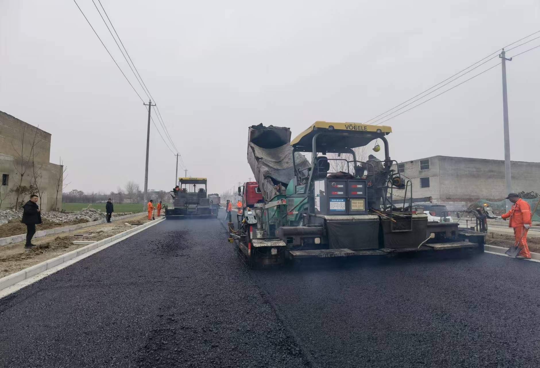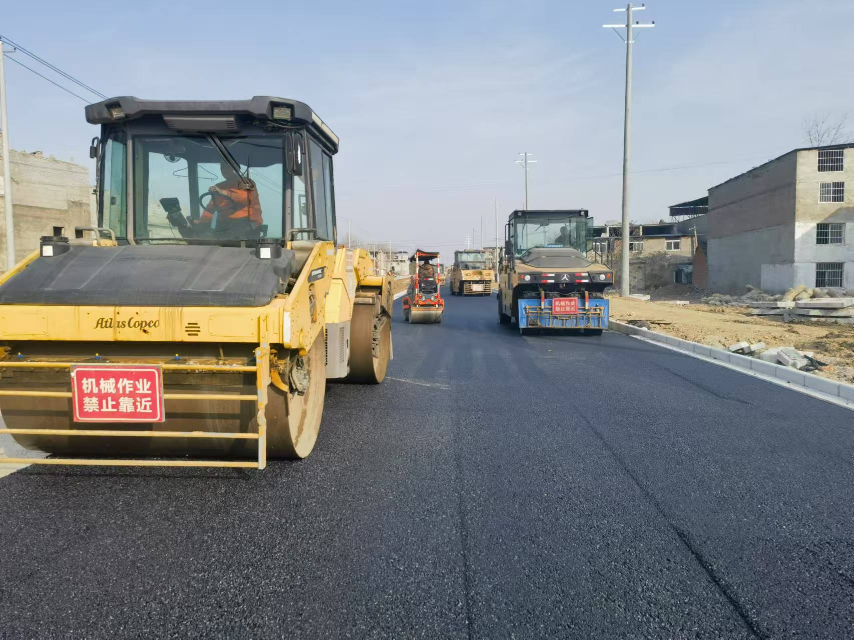 12月12日下午,在施工现场几台大型机械正在作业,摊铺机以每分钟两三米的速度行进摊铺沥青,操作手在驾驶台上配合作业,压路机跟在后面对路面进行碾压,整个工程正有序进行。
