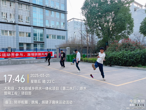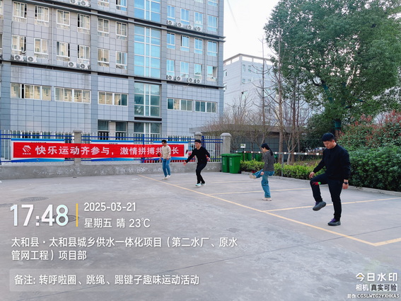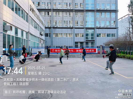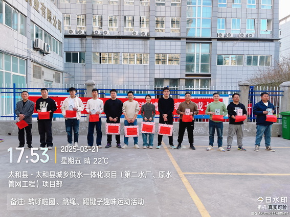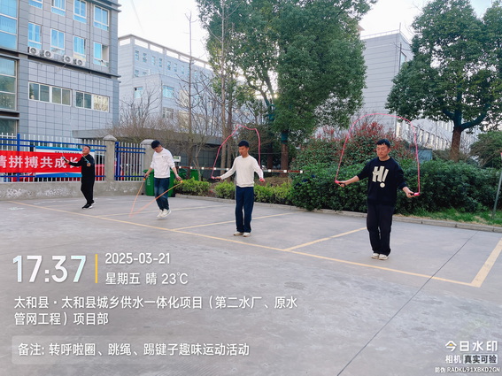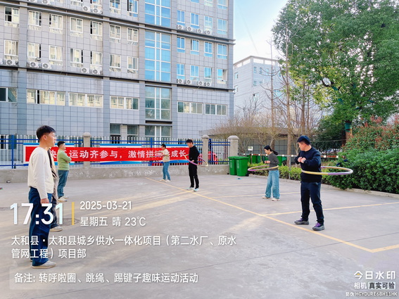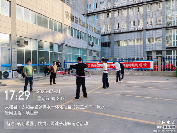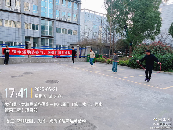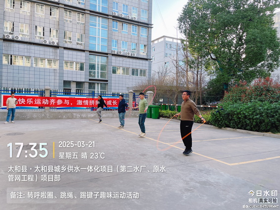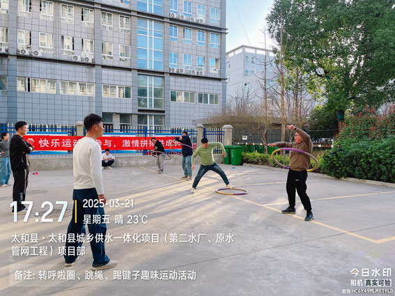 为丰富职工业余生活,增强团队凝聚力,太和供水一体化项目于3月21日下午日组织了一场别开生面的职工趣味运动比赛。比赛项目包括转呼啦圈、跳绳和踢毽子,吸引了众多职工的积极参与。