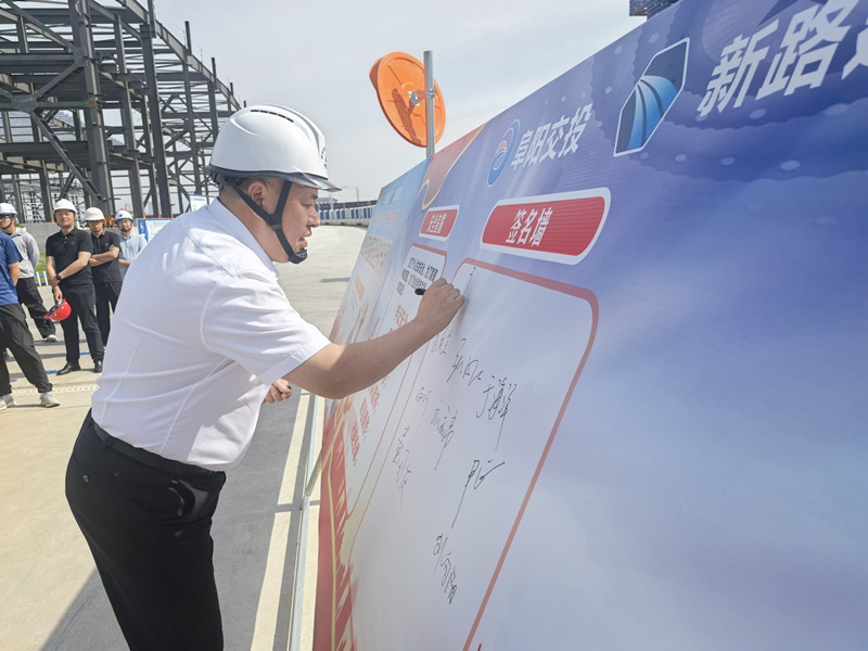 宣誓结束后,阜阳交通能源投资有限公司总工程师唐项亮作动员讲话并进行安全承诺签字仪式,各代表在印有活动主题和安全生产承诺的大型签名板上依次上前签名,一笔一划都时刻警醒大家不忘承诺、履职尽责。