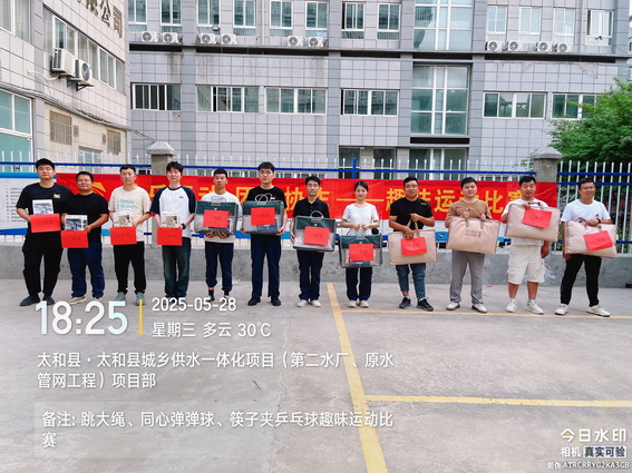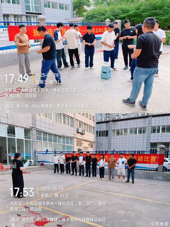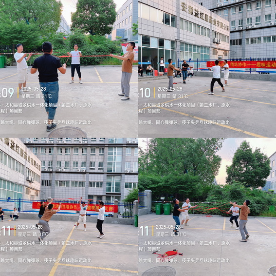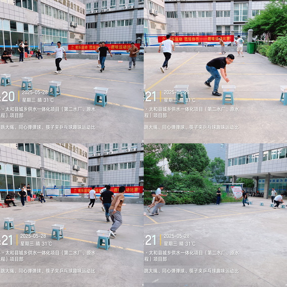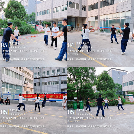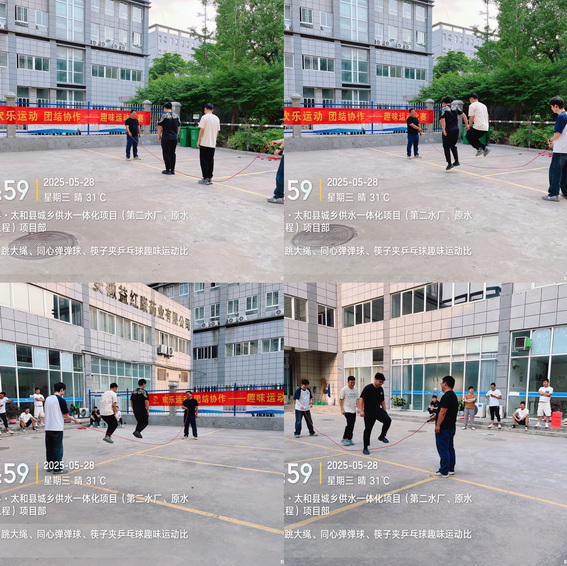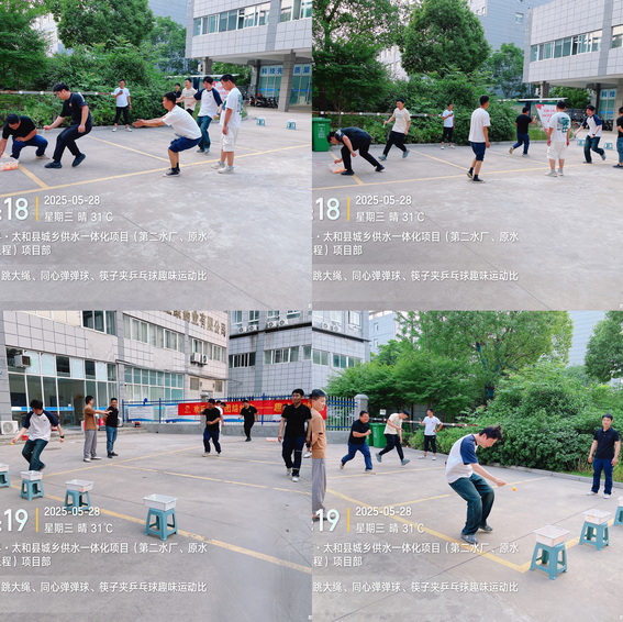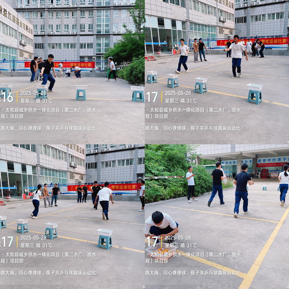 为丰富职工业余文化生活,营造积极向上、团结协作的工作氛围,进一步增强项目团队的凝聚力和向心力,5月28日下午,太和供水一体化项目精心组织了一场别开生面的职工趣味运动比赛。活动现场气氛热烈,欢声笑语不断,“跳大绳”、“同心弹弹球”、“筷子夹乒乓球”三项趣味赛事轮番上演,充分展现了太和供水一体化项目全体成员的活力与风采。
